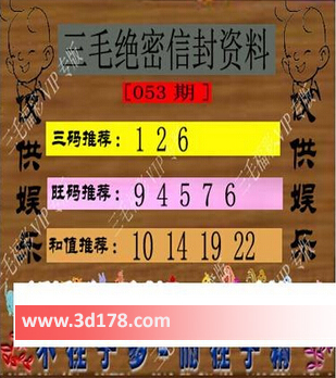 3d之家第2016053期三毛绝密信封资料图:福彩3d第053期三毛绝密信封资料图详解:三码推荐:1 2 6旺码推荐:9 4 5 7 6和值推荐:10 14 19 22三毛图库由3D之家3D图库频道原创,仅供彩民参考,温馨提供。