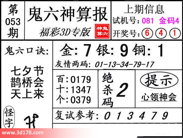 鬼六口诀:七夕节,鹊桥会,天上来。复式参考:013479三码推荐:金胆:7,银胆:9,铜胆:1定位复式:百位:0179十位:0379绝杀码:2友情两码:01-13-34-79-17 该鬼六图库由3D之家3D图库频道原创,仅供彩民参考,温馨提供。