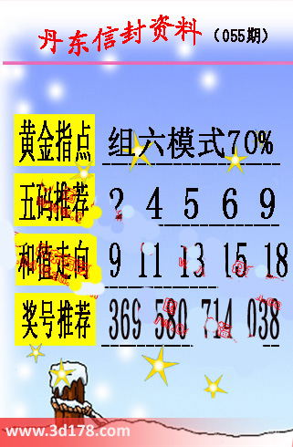 第2016055期丹东信封资料推荐:黄金指点:组六模式70%五码推荐:24569和值走向:9 11 13 15 18奖号推荐:369 580 714 038 该丹东图库由3D之家3D图库频道原创,仅供彩民参考,温馨提供。