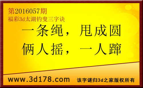 一条绳:一条绳子;解1有7;甩成圆:甩成圆形;解0防5;俩人摇:俩人摇摆;解2有3;一人蹿:一人蹿过;解1防2. 六码复式:012357(含组三)组选10注:012 135 158 246 269 346 369 457 479 568 3d太湖图库由3d之家3D图库频道原创,仅供彩民参考,温馨提供。