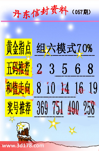 第2016057期丹东信封资料推荐:黄金指点:组六模式70%五码推荐:23568和值走向:8 10 14 16 19奖号推荐:369 751 490 258 该丹东图库由3D之家3D图库频道原创,仅供彩民参考,温馨提供。