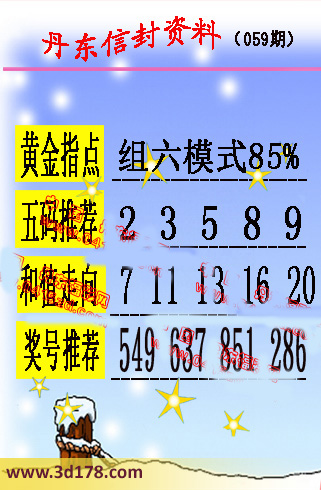 第2016059期丹东信封资料推荐:黄金指点:组六模式70%五码推荐:23589和值走向:7 11 13 16 20奖号推荐:549 637 851 286 该丹东图库由3D之家3D图库频道原创,仅供彩民参考,温馨提供。