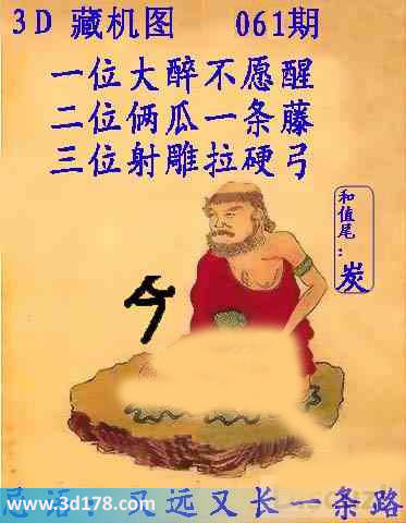 一位:大醉不愿醒二位:两瓜一条藤三位:射雕拉硬弓和尾:炭忌语:又远又长一条路