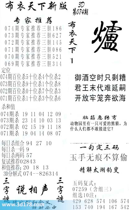 本期3d之家布衣图库3d布衣天下新版详解:定位杀号推荐:百位杀5 十位杀4 个位杀2杀和值推荐:19 11 04 12 09每日杀组合:94 27 10每日杀一码:9每日杀两码:57复式推荐:02943和值推荐:20 18 133d分解式:074--8263143d布衣图库玄机诗:御酒空时只剩糟 ,君王末代难延嗣,开放牢笼奔欲海。该布衣图库由3D之家3D图库频道原创,仅供彩民参考,温馨提供。