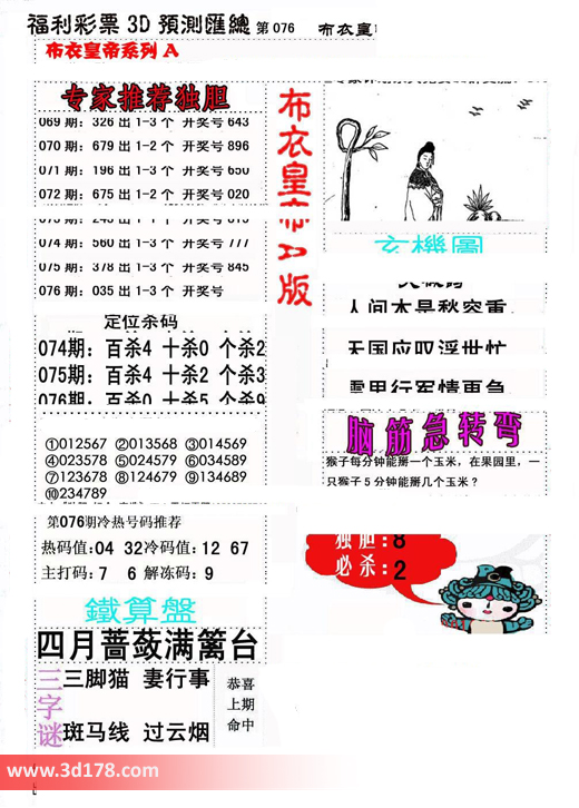 福彩3d第2016076期布衣天皇帝A版布衣专家独家推荐:
