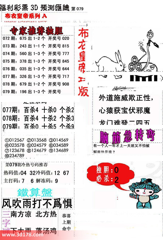 福彩3d第2016079期布衣天皇帝A版布衣专家独家推荐: