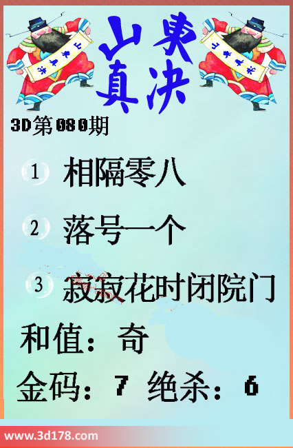 福彩3d第080期山东真诀图如下所示:第2016080期山东真诀图金码推荐:1、相隔零八2、落号一个3、寂寂花时闭院门和值:奇金码:7 绝杀:6该丹东图库由3D之家3D图库频道原创,仅供彩民参考,温馨提供。