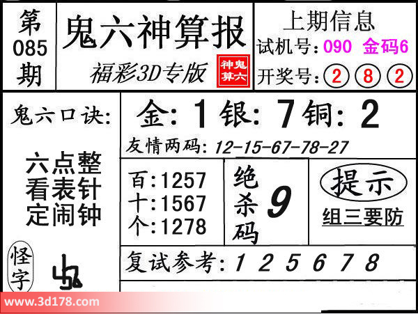 3d第16085期鬼六神算报为您推荐鬼六口诀: