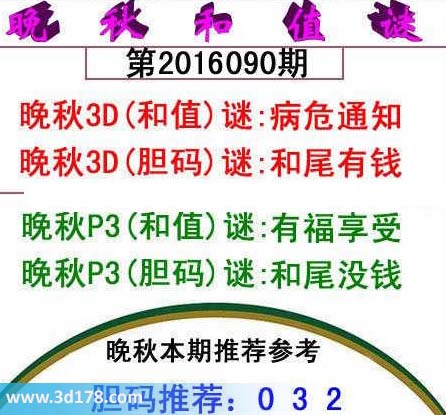 晚秋3D(和值)谜:病危通知晚秋3D(胆码)谜:和尾有钱晚秋p3(和值)谜:有福享受晚秋p3(胆码)谜:和尾没钱胆码推荐:032