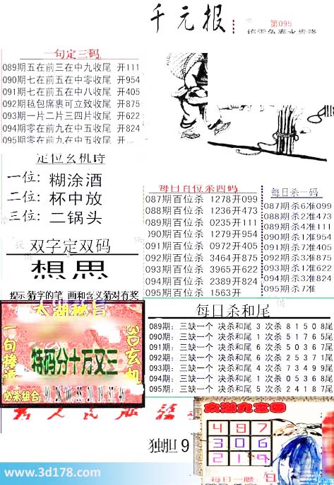 福彩3d第2016095期布衣千元报图详情分析如下:一句定定三码:095期零在前九在中五收尾一位:糊涂酒二位:杯中放三位:二锅头每日百位杀四码:1563每日杀一码:7三缺一个决杀和尾5 次杀24187尾