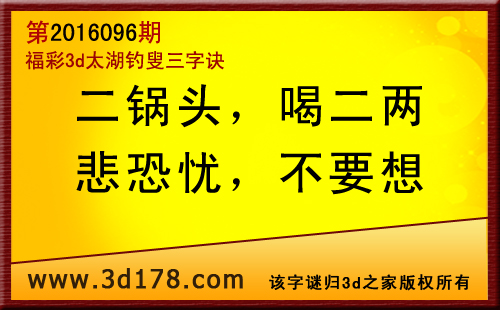 福彩3d第2016096期太湖图库解字谜详解:二锅头:二锅头是一种酒的名称,解9;