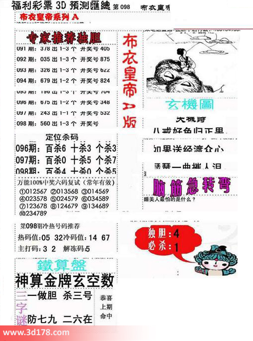 福彩3d第2016098期布衣天皇帝A版布衣专家独家推荐:
