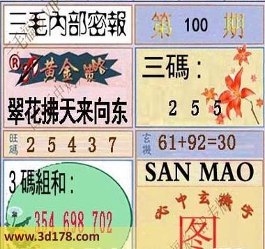 3d之家三毛图库第16100期三毛内部密报图详解:黄金策略:翠花拂天来向东三码:257旺码:234573码组合:354 698 702玄机:61+92=30必中玄机字:图