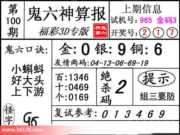 3d之家3d鬼六神算报第100期分析如下:鬼六口诀:小蝌蚪,好大头,上下游