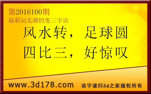 福彩3d第2016100期太湖图库解字谜详解: