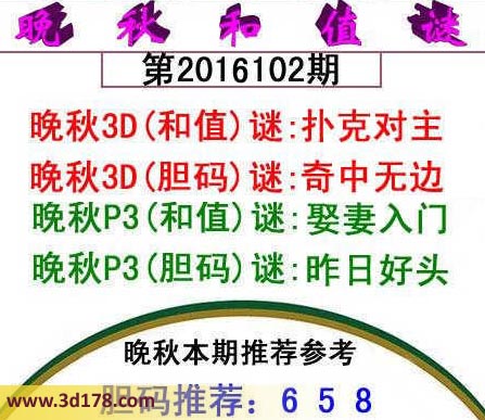 晚秋3D(和值)谜:扑克对主晚秋3D(胆码)谜:奇中无边晚秋p3(和值)谜:娶妻入门晚秋p3(胆码)谜:昨日好头胆码推荐:658