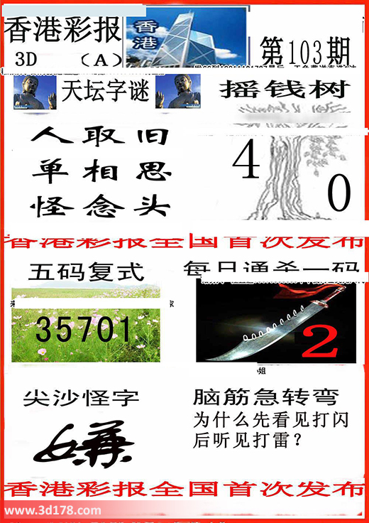 3d之家3d香港彩报第16103期摇钱树:本期3d香港彩报图详情如下:天坛字谜:人取旧,单相思,怪念头。摇钱树:4 0五码复式:35701每日通杀一码:2脑筋急转筋:为什么先看见打闪后听见打雷?该香港彩报由3D之家3D图库频道原创,仅供彩民参考,温馨提供。