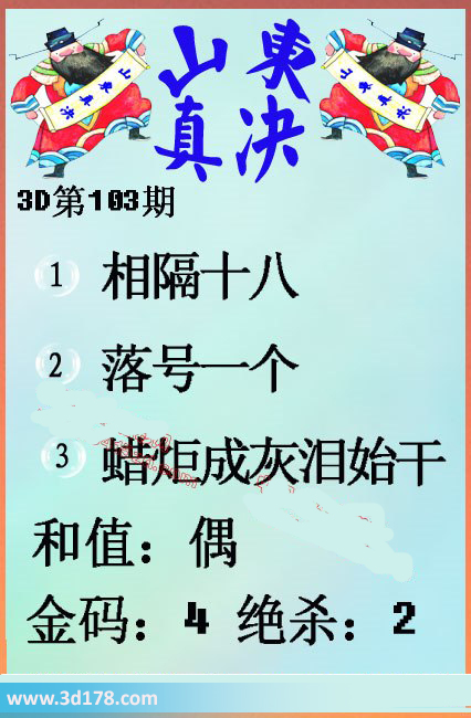 福彩3d第103期山东真诀图如下所示:第2016103期山东真诀图金码推荐:1、相隔十八2、落号一个3、蜡炬成灰泪始干和值:偶金码:4 绝杀:2该丹东图库由3d之家3d图库频道原创,仅供彩民参考,温馨提供。
