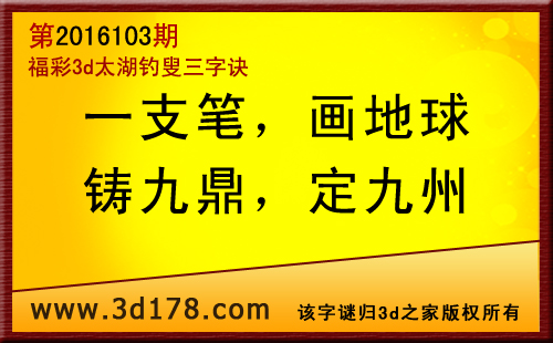 福彩3d第2016103期太湖图库解字谜详解:一支笔:一只长笔杆,用来书写字,解1;