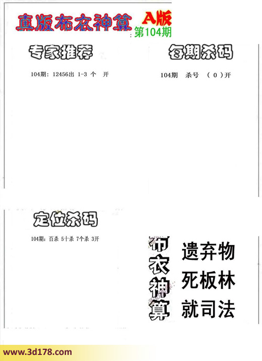 3d之家布衣图库之布衣神算图第2016104期详解:专家推荐: