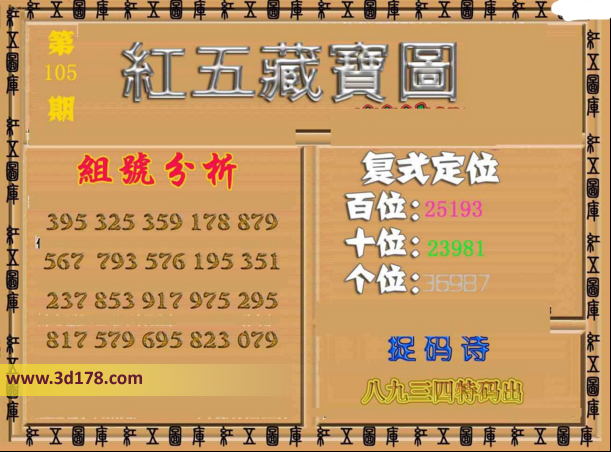 3d之家3d红五藏宝图第2016105期为您推荐复式定位、捉码诗以及组号分析: