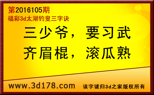福彩3d第2016105期太湖图库解字谜详解:三少爷:家里有三位小少爷,解3;