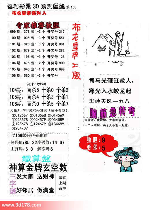 福彩3d第2016106期布衣天皇帝A版布衣专家独家推荐: