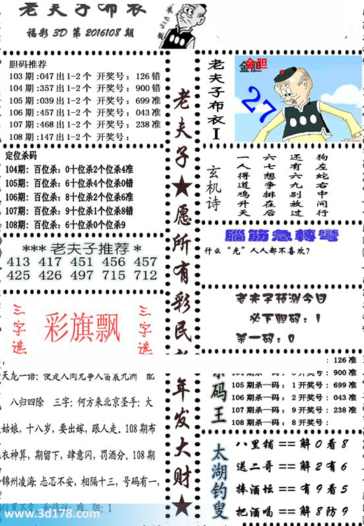 3d第2016108期老夫子布衣预测今日必下胆码图:3d之家第16108期老夫子布衣图库详解:108期:147 出1-2个 开奖号:108期:百位杀6 十位杀0 个位杀9老夫子精选推荐:413 417 451 456 457 425 426 497 715 712老夫子预测今日必下胆1,杀一码0脑筋急转弯:什么“光”人人都不喜欢?该布衣图库由3d之家3d图库频道原创,仅供彩民参考,温馨提供。