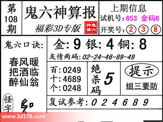 3d之家3d鬼六神算报第108期分析如下:鬼六口诀:春风暖,把酒临,醉仙翁