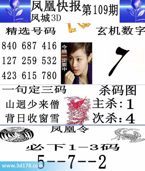 3d第16109期凤凰快报内容解析:玄机数字:7精选号码:840 687 416 423 615 780 127 259 532一句定三码:山迥少来僧,背日收窗雪杀码图:主杀:1 次杀:4凤凰令:必下1-3码,5-7-2