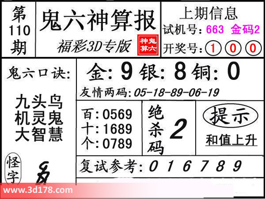 3d之家3d鬼六神算报第110期分析如下:鬼六口诀:九头鸟,机灵鬼,大智慧