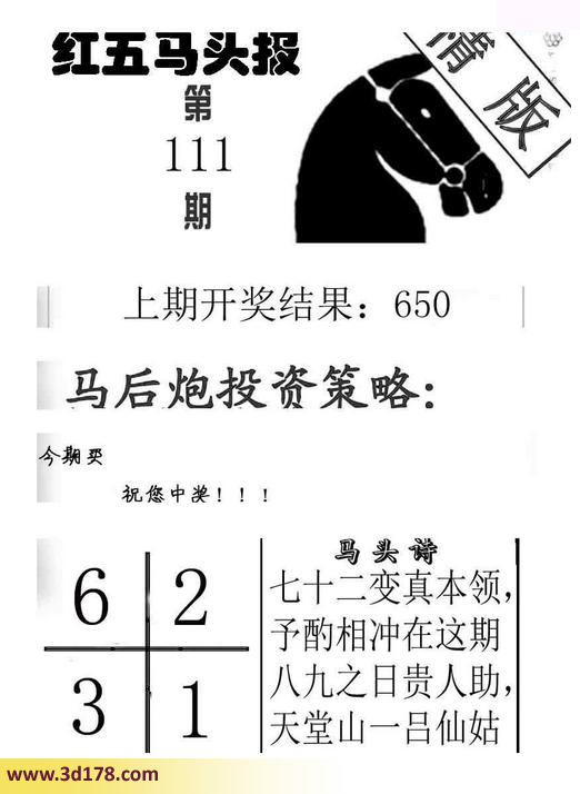 3d第2016111期红五马头报本期马头诗详解:上期开奖号码:650