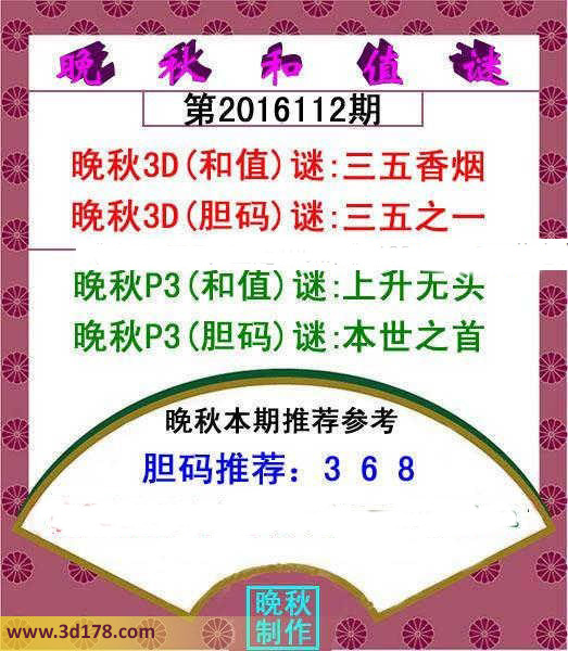 晚秋3D(和值)谜:三五香烟晚秋3D(胆码)谜:三五之一晚秋p3(和值)谜:上升无头晚秋p3(胆码)谜:本世之首胆码推荐:368
