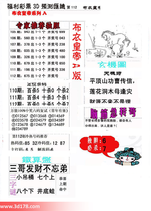 福彩3d第2016112期布衣天皇帝A版布衣专家独家推荐: