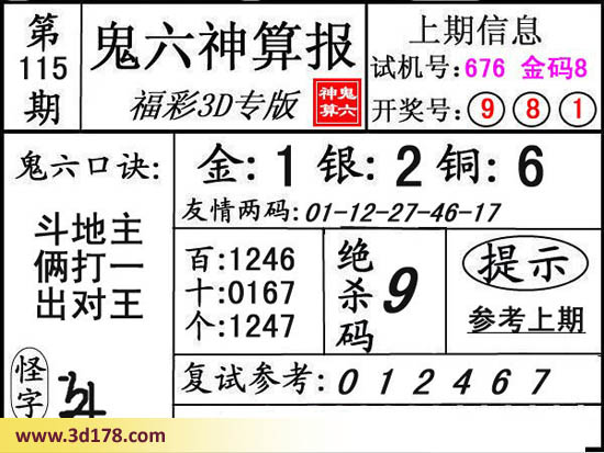 3d第16115期鬼六神算报为您推荐鬼六口诀: