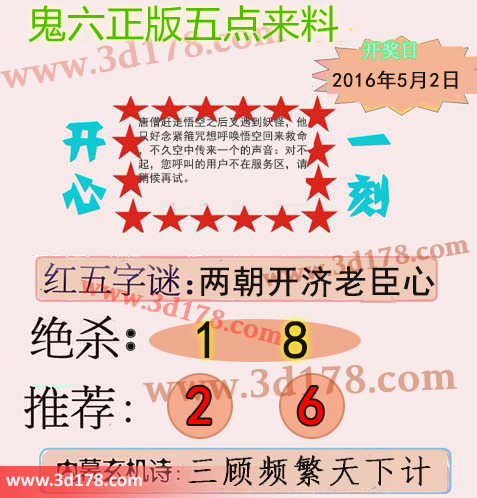 3d鬼六图库第16116期鬼六正版五点来料图:字谜:两朝开济老臣心