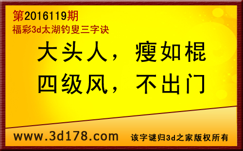 福彩3d第2016119期太湖图库解字谜详解:大头人:头很大,那么身子看起来就小,大笔画解3;