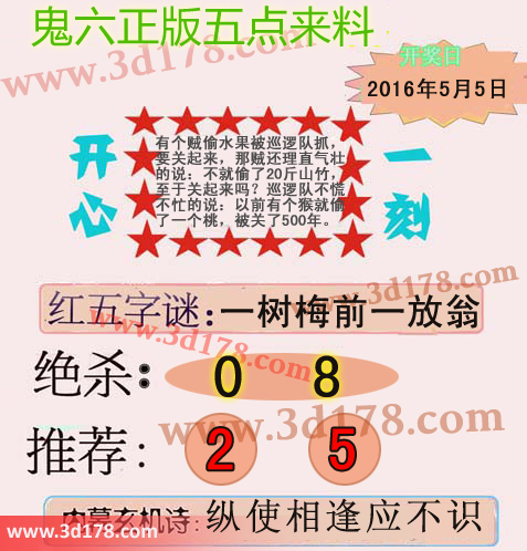 3d鬼六图库第16119期鬼六正版五点来料图:字谜:一树梅前一放翁