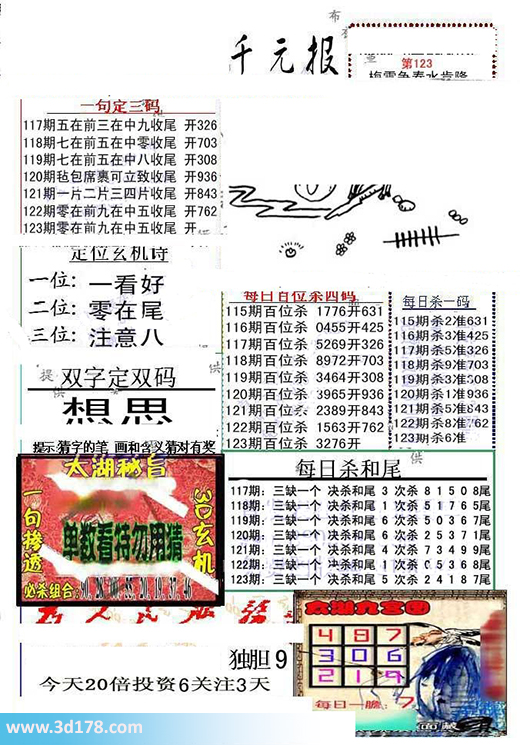 3d布衣图库布衣千元报第2016123期定位玄机诗:福彩3d第2016123期布衣千元报图详情分析如下:一句定三码:123期 零在前九在中五收尾一位:一看好二位:零在尾三位:注意八每日杀一码:6每日百位杀四码:3276三缺一个决杀和尾5 次杀2418尾布衣图库由3D之家3D图库频道原创,仅供彩民参考,温馨提供。