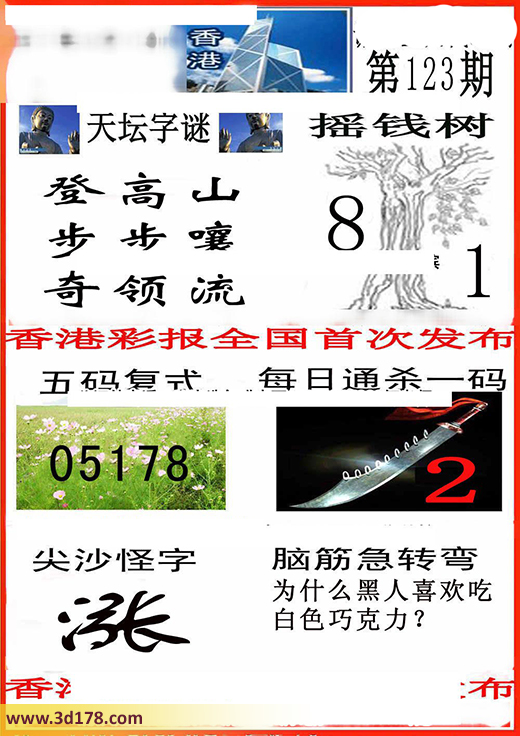 3d之家3d香港彩报第16123期摇钱树:本期3d香港彩报图详情如下:天坛字谜:登高山,步步嚷,奇领流。摇钱树:8 1五码复式:05178每日通杀一码:2脑筋急转筋:为什么黑人喜欢吃白色巧克力?该香港彩报由3d之家3d图库频道原创,仅供彩民参考,温馨提供。
