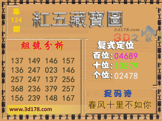 3d之家3d红五藏宝图第2016124期为您推荐复式定位、捉码诗以及组号分析: