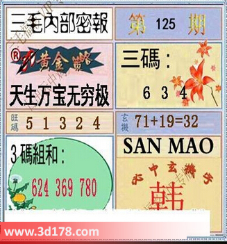 福彩3d第125期三毛内部密报综合推荐如下:3d之家三毛图库第16125期三毛内部密报图详解:黄金策略:天生万宝无穷极三码:634旺码:513243码组合:624 369 780玄机:71+19=32必中玄机字:韩该三毛内部密报图库由3d之家3d图库频道原创,仅供彩民参考,温馨提醒。
