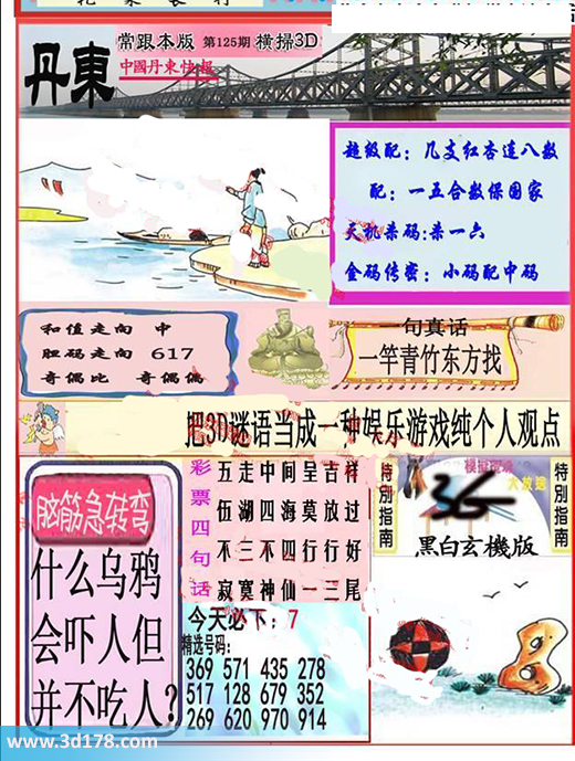3d之家第2016125期丹东快报图:3d第2016125期丹东快报图详解:超级配:几支红杏连八数配:一五合数保国家天机杀码:杀一六和值走向:中胆码走向:617奇偶比:奇偶偶金码传密:小码配中码精选号码:369 571 435 278 517 128 679 352 269 620 970 914脑筋急转弯:什么乌鸦会吓人但并不吃人?该丹东图库由3d之家3d图库频道原创,仅供彩民参考,温馨提供。