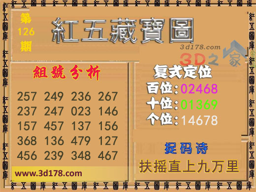 3d之家3d红五藏宝图第2016126期为您推荐复式定位、捉码诗以及组号分析: