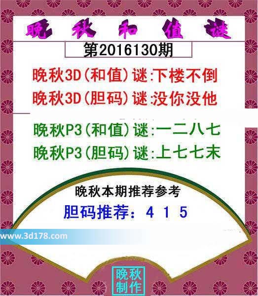 晚秋3D(和值)谜:下楼不倒