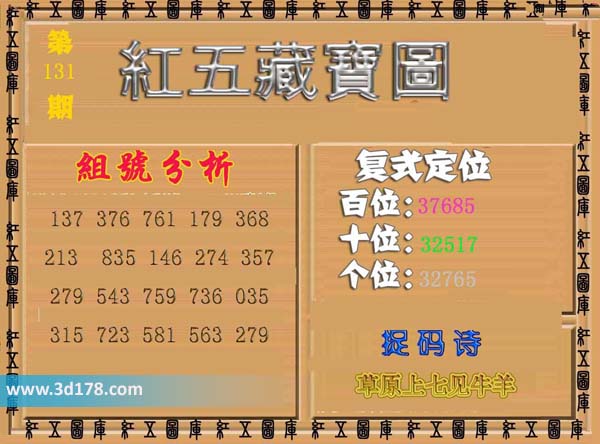3d之家3d红五藏宝图第2016131期为您推荐复式定位、捉码诗以及组号分析: