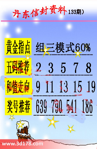 福彩3d第133期丹东信封图如下所示:第2016133期丹东信封资料推荐:黄金指点:组六模式60%五码推荐:23578和值走向:9 11 13 15 19奖号推荐:639 790 541 186该丹东图库由3d之家3d图库频道原创,仅供彩民参考,温馨提供。