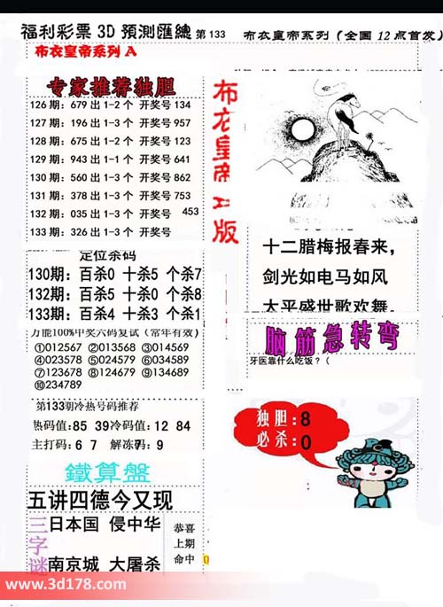 福彩3d第2016133期布衣皇帝A版布衣专家独家推荐: