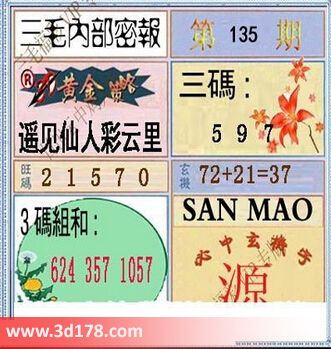 福彩3d第135期三毛内部密报综合推荐如下:3d之家三毛图库第16135期三毛内部密报图详解:黄金策略:遥见仙人彩云里三码:597旺码215703码组合:624 357 057玄机:72+21=37必中玄机字:源该三毛内部密报图库由3d之家3d图库频道原创,仅供彩民参考,温馨提醒。