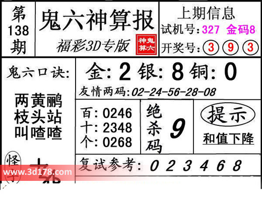 3d第16138期鬼六神算报为您推荐鬼六口诀: